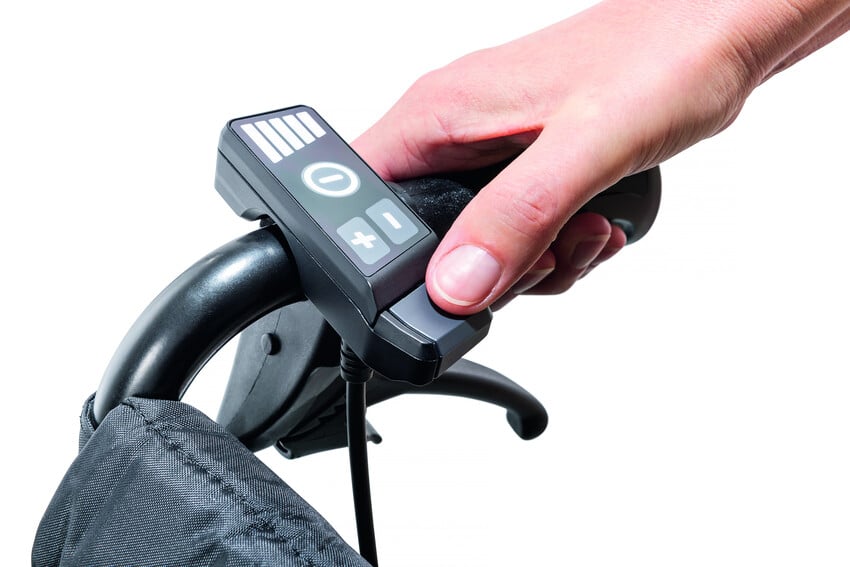 De nieuwste rolstoel duwhulp van de Duitse fabrikant Alber. Zeer compact model en heel makkelijk te bedienen.
