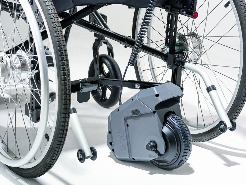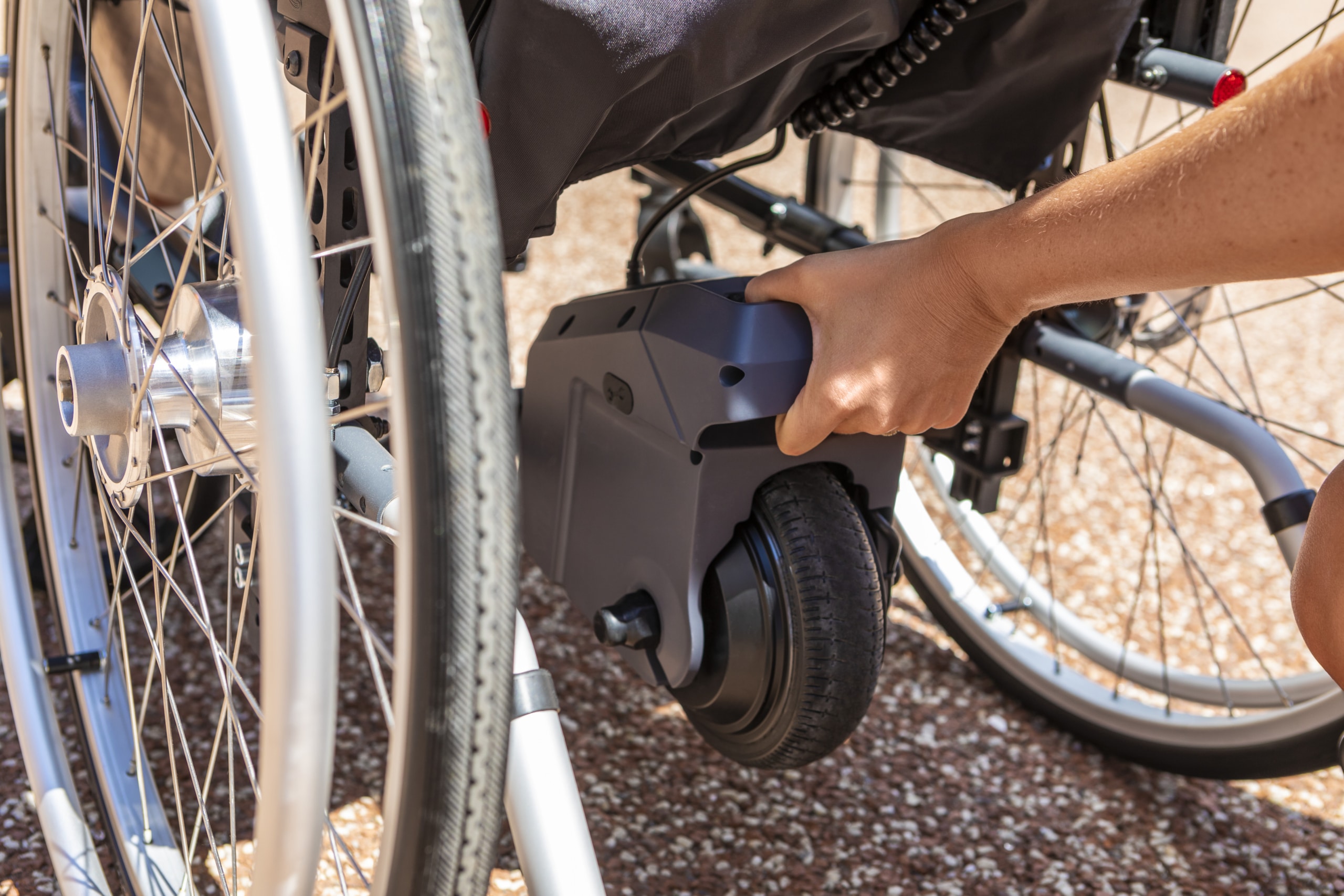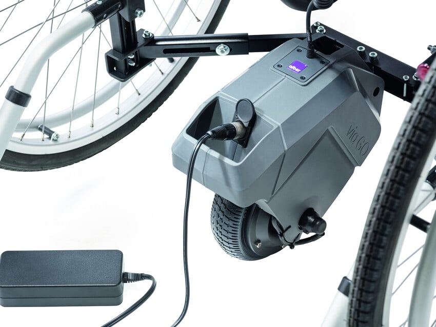 De aankoppelbeugel blijft onder de rolstoel en kan mee opgevouwen worden. De motor hangt u met één beweging aan de beugel en de bedieningsunit klikt u in de houder, waarna u klaar bent om weg te gaan.