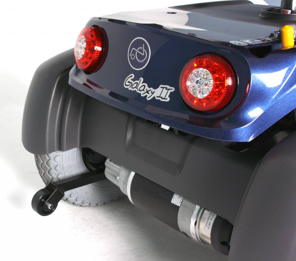 De Galaxy is een scootmobiel die standaard zeer compleet is. De stoel wordt bijvoorbeeld standaard met hoofdsteun en veiligheidsgordel geleverd. De grote stoel van de Galaxy kunt u volledig naar wens in stellen. de rug is in hoek verstelbaar. De armleuningen zijn in breedte en hoogte te verstellen, deze zijn tevens voorzien van reflectoren. Aan de zijkant van de treeplank zijn ook reflectoren geplaatst. Hierdoor bent u goed zichtbaar voor uw medeweggebruikers.