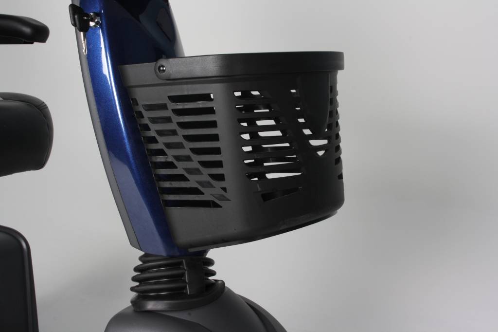 De bediening en het display van de scootmobiel is eenvoudig te noemen. Op het bedieningspaneel leest u de accu indicatie af en vindt u de bediening van de verlichting, richtingaanwijzers en de hoog/laag stand. De snelheidsregelaar bevindt zich ook op het bedieningspaneel.  Aan de voorzijde van de scootmobiel zit de demontabele mand voor boodschappen edg. De ruime treeplank geeft u  ruimte voor uw voeten ook als u een lange lichaamslengte heeft.