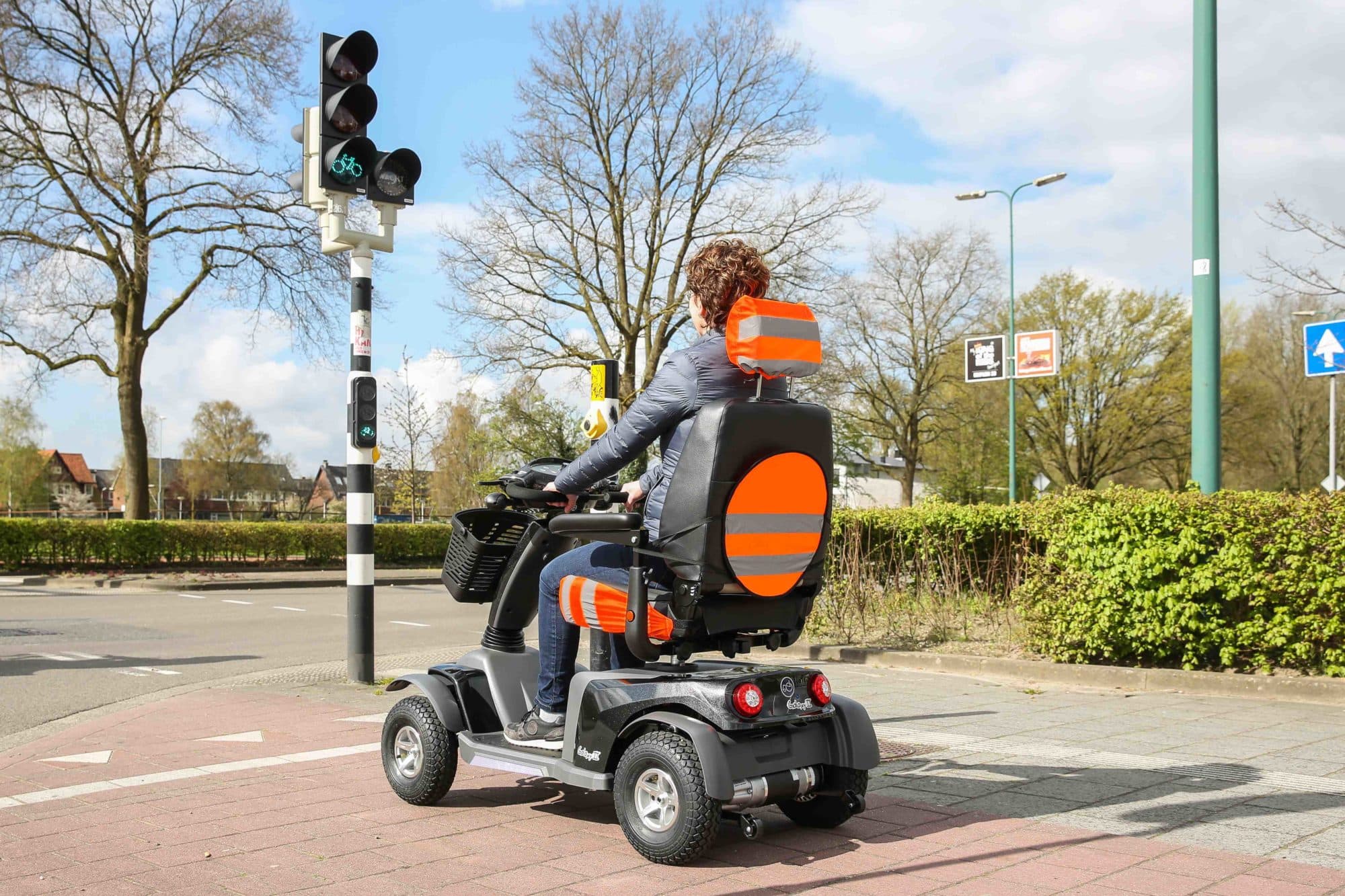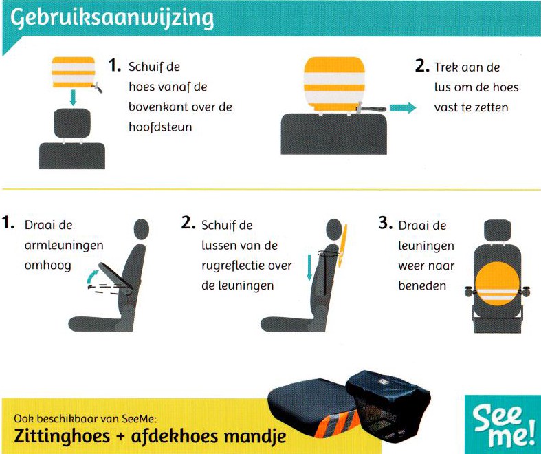 De hoofdsteunhoes met reflectie past over iedere scootmobiel hoofdsteun. Daarnaast is het ook het opbergzakje van de rugreflectie. Superhandig en goed bedacht! De rugreflectie wordt met elastiek bevestigd aan de armleuningen. De felle neon en oranje kleur met reflectie banden bent u zichtbaar vanaf een grote afstand. Beide producten zijn weerbestendig en uitwasbaar.