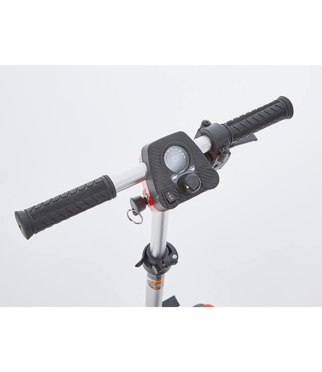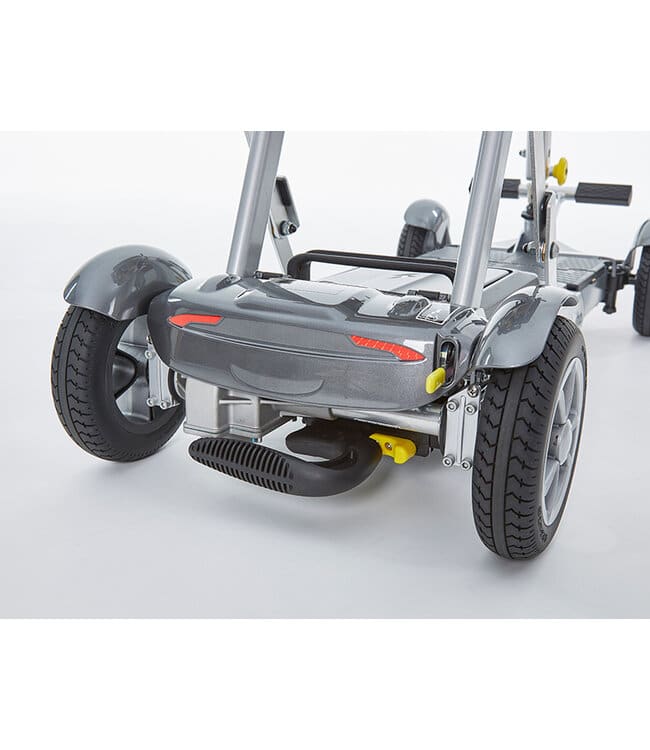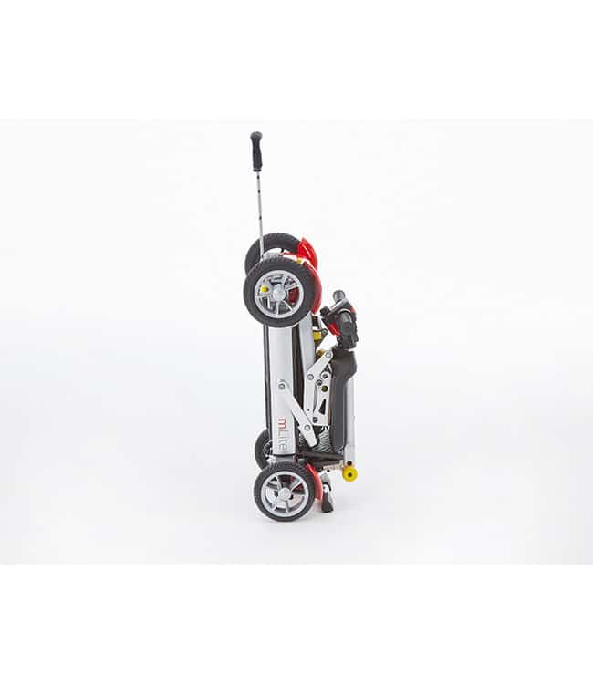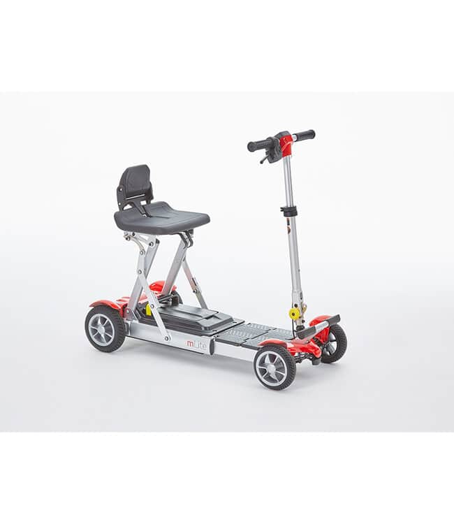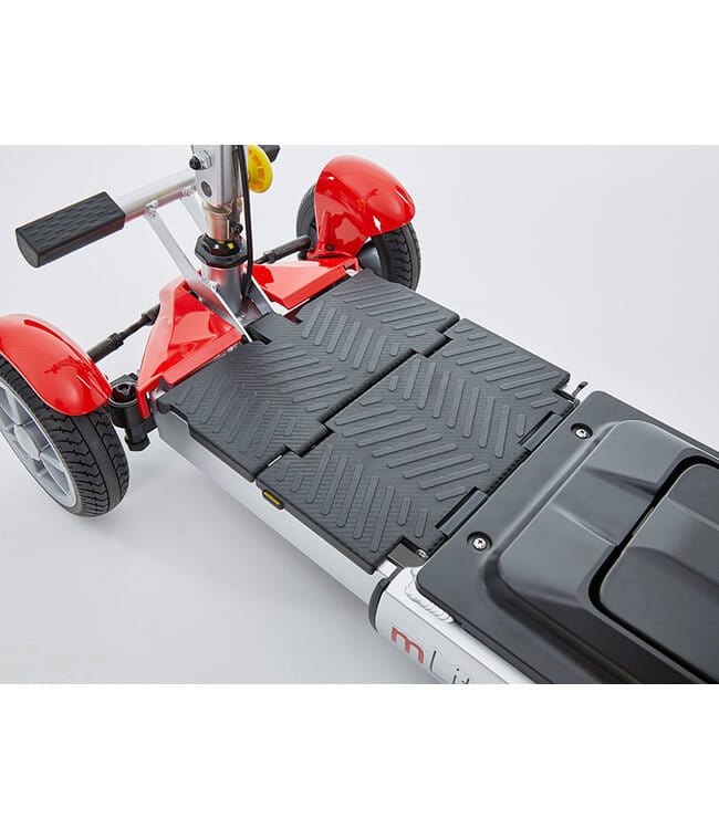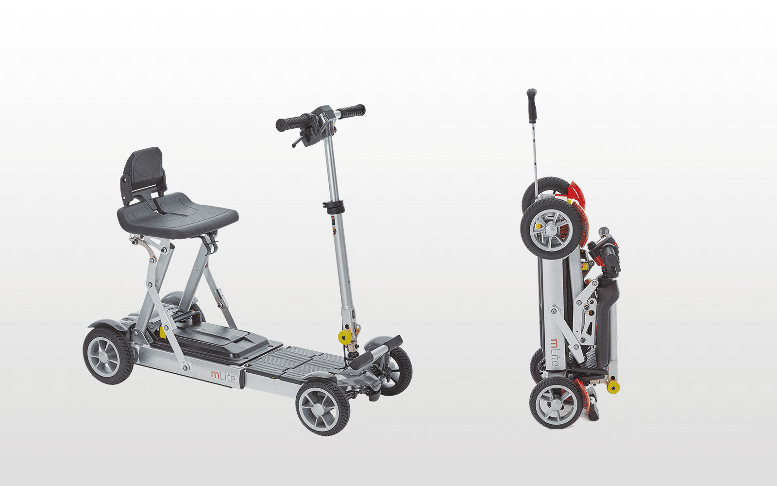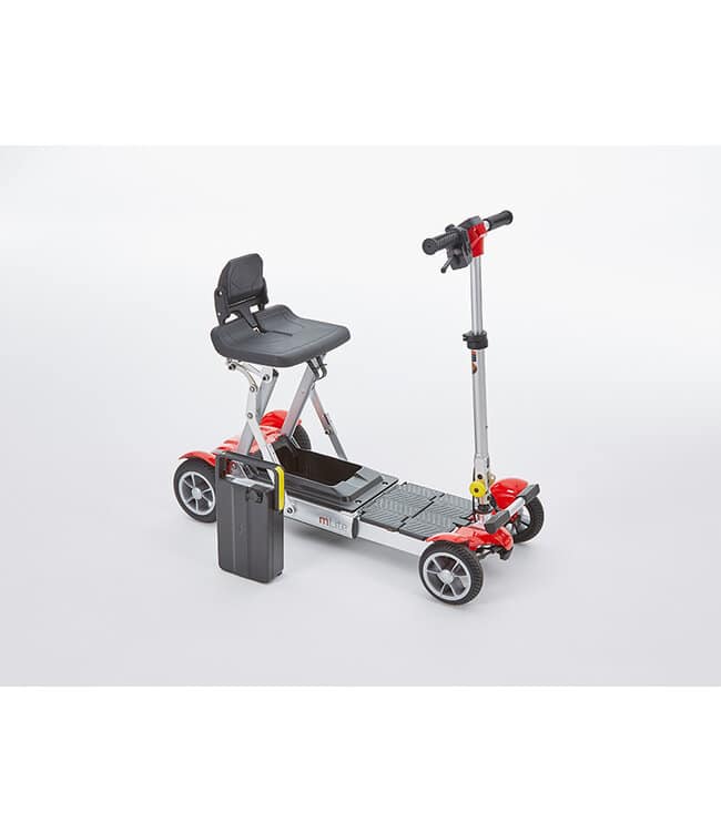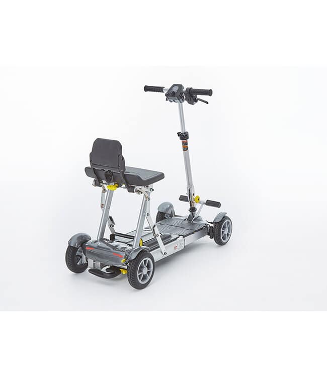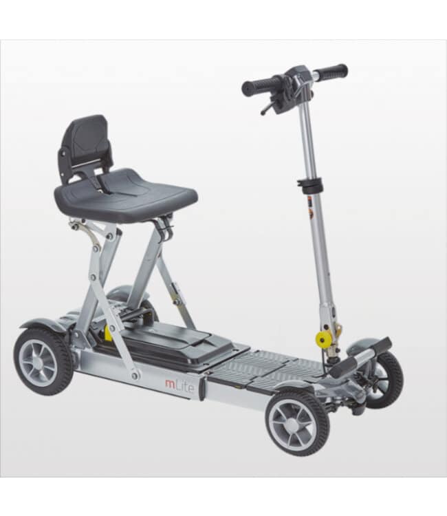 De mLite lichtgewicht vouwbare scootmobiel is een van de lichtste in de markt. 19,9 kilogram. Ingeklapt is de mLite met uitschuifbare handgreep makkelijk als "rolkoffer" te verplaatsen. De lithium accu is lichtgewicht, eenvoudig uitneembaar en op te laden in huis. De mLite kan bijvoorbeeld dan in de auto blijven staan. Door de verlengde voetsteunen kunnen langere personen ook comfortabel rijden. De verstelbare stuurkolom kan in de juiste hoogte worden gezet. Geen kans op lekke banden door de zachte massieve banden. De bediening is eenvoudig. De gashendel is lang en prima geschikt voor grote handen. Het stoeltje is voorzien van een wegklapbaar rugsteuntje. U bent van harte welkom in onze showroom in Amersfoort voor een demonstratie. 085 2014 214.