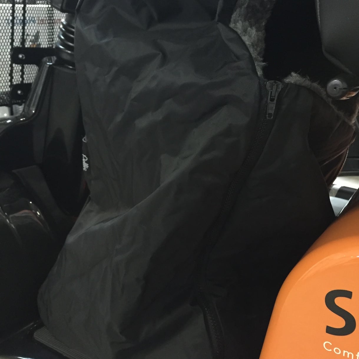 Deze warm gevoerde beenwarmer legt u eenvoudig over uw benen heen wanneer u op de scootmobiel zit. Vastmaken gaat heel gemakkelijk door middel van het klittenband, waarmee u het beenkleed om uw middel of om de stoel bevestigt. Onderaan de beendeken bevinden zich twee ritssluitingen, waardoor u de zak heel handig rondom uw enkels kunt sluiten. De buitenzijde van het schootskleed is gemaakt van waterafstotend materiaal. Aan de voorzijde heeft het kleed twee modieuze gekleurde strepen. De oranje streep zorgt ervoor dat u goed zichtbaar bent in het verkeer.
