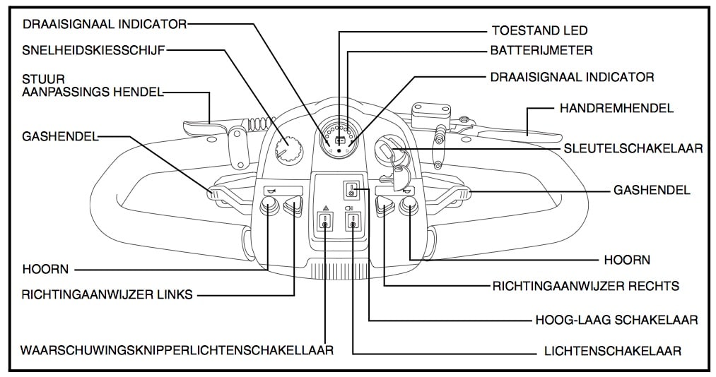 De scootmobiel is voorzien van verlichting en het remlicht wordt automatisch in werking gesteld zodra u de gashendel los laat.