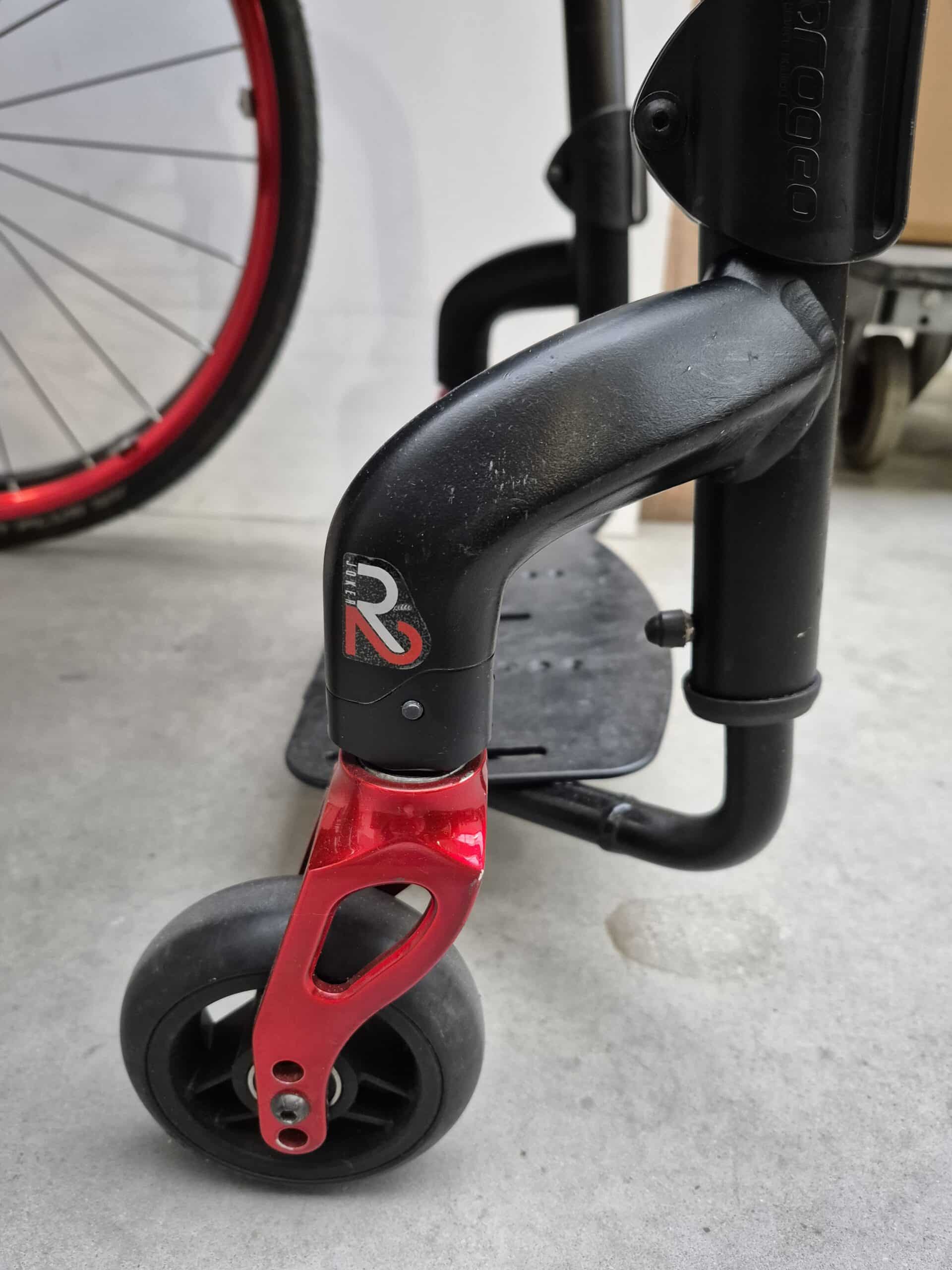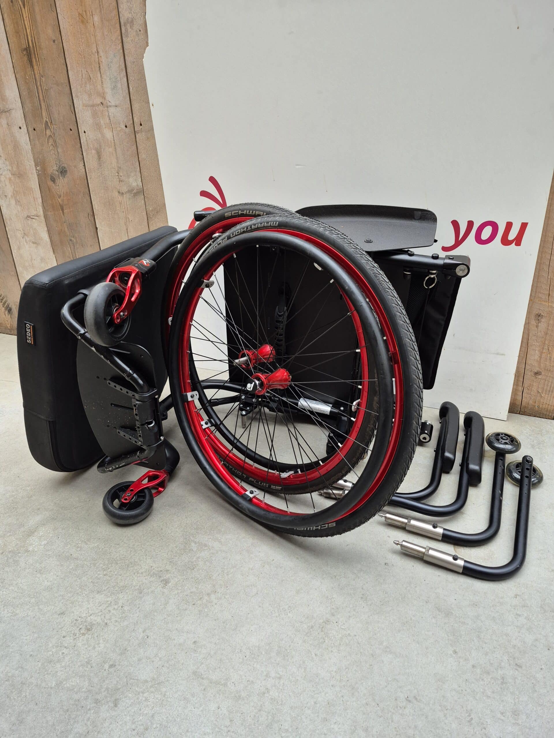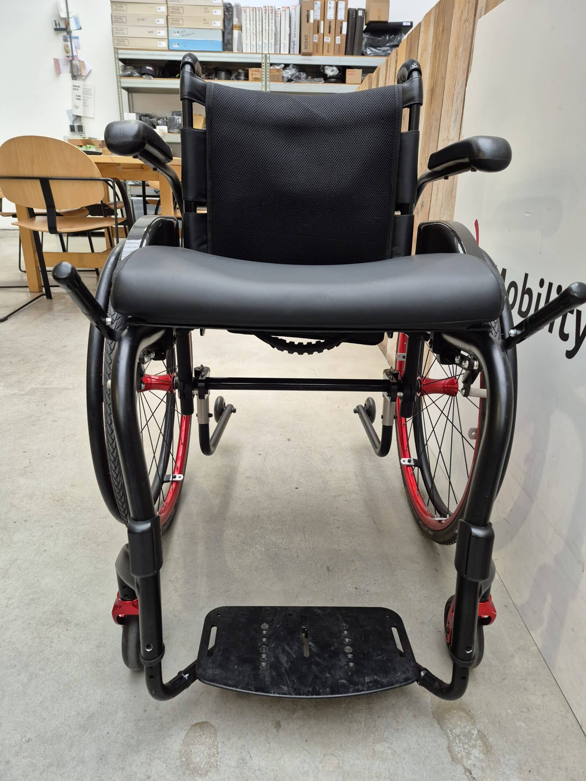 VERKOCHT Deze Progeo Joker R2 vastframe rolstoel komt uit 2019. Een stijf, lichtgewicht rolstoel. Voorzien van neerklapbare rug, afneembare wielen, wegdraaibare en afneembare armleggers, dubbele afneembare anti kiep wielen en instelbare spanbandenrug. De voetplaat is wegklapbaar voor een makkelijkere instap. De verlengde duwhendels zijn neerklapbaar. Het frame is matzwart en de velgen en voorvorken Bright Red. De zitplaat en de spatborden zijn gemaakt van ultralicht Carbon. Wij leveren tevens het Sedeo zit-element mee. U kunt ook uw eigen zitkussen gebruiken. Maatvoering: Zitbreedte: 45 cm. Zitdiepte: 45 cm. Rughoogte: 45 cm. Onderbeenlengte: 42 cm. Zithoogte achter: 45 cm. Zithoogte voor: 50 cm. 24" Schwalbe Marathon Plus achterbanden. 4" soft voorwielen met aluminium velg. Komt u proefzitten in deze erg prettige rolstoel? Bel voor een afspraak 085 2014 214.