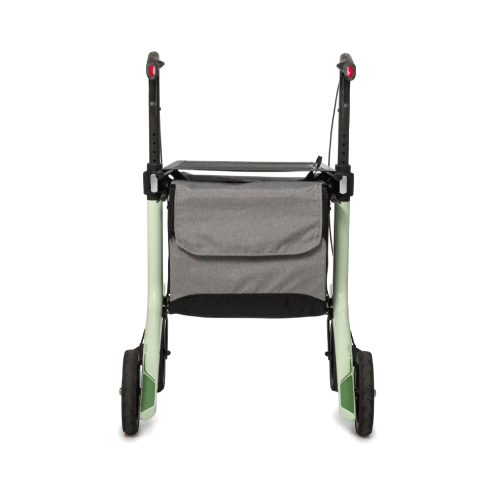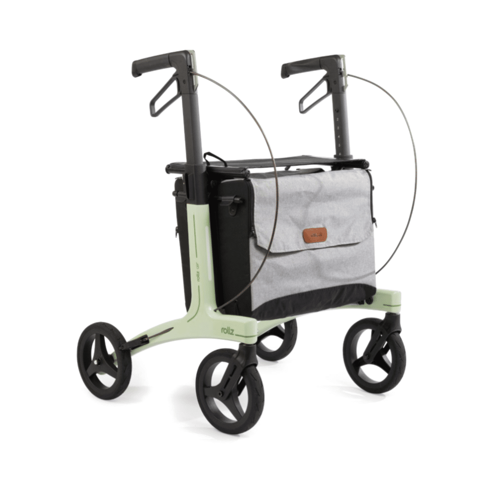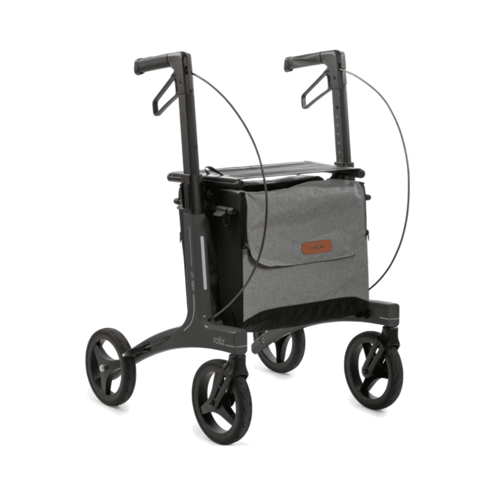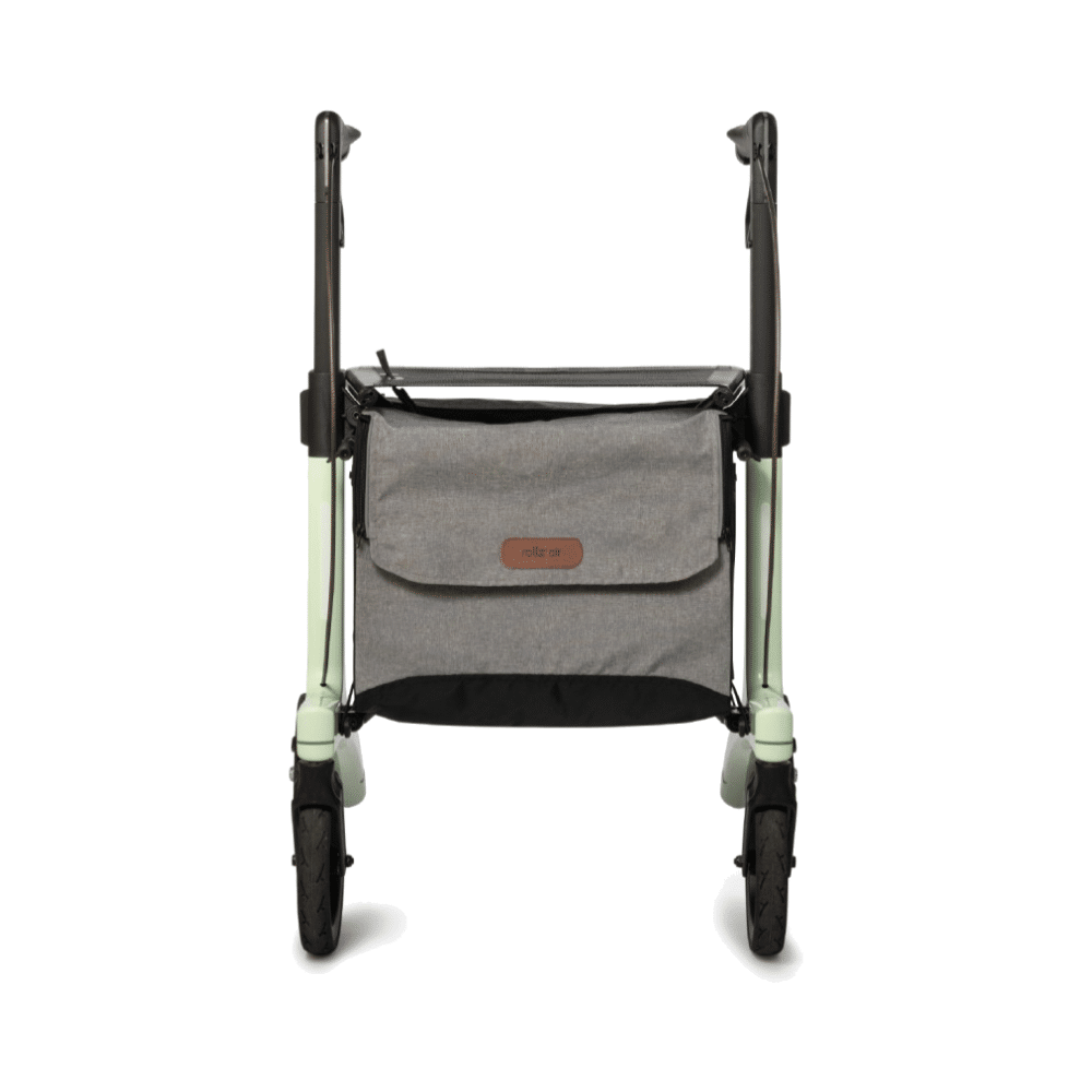 Veel lichte rollators worden onstabiel als je er een zware tas aan hangt. De Rollz Air lost dit op met twee tassen die slim over het frame zijn verdeeld (voor en achter). Samen kunnen deze tassen tot 10 kg aan boodschappen dragen zonder dat de rollator instabiel of lastiger te besturen wordt. De technische onderdelen, zoals de kruisverbinding onder de zitting, zijn uit het zicht weggewerkt voor een rustig uiterlijk.