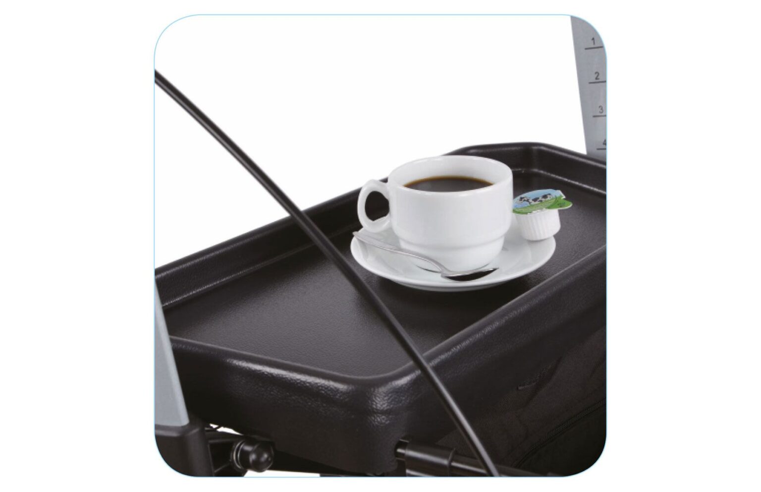 Het dienblad kan eenvoudig op de zitting van de rollator bevestigd worden. Hoge randen en een antislip oppervlak maken het veilig om eten en drinken te vervoeren.