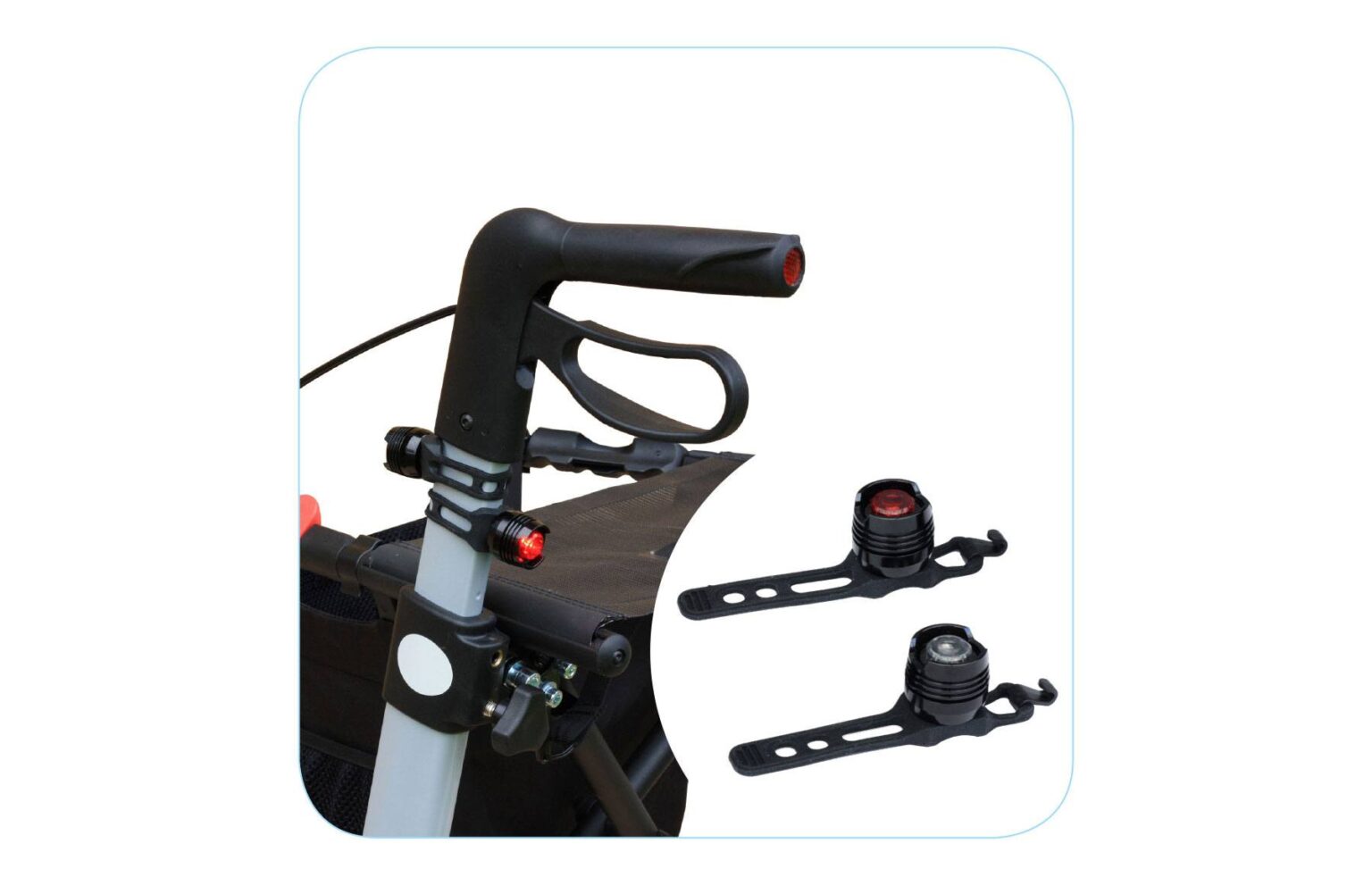 De LED-zaklamp is gemakkelijk aan het frame te bevestigen en geeft een duidelijk en scherp licht. De lichtbundel schijnt op het gebied vlak voor de rollator. Batterijen zijn inbegrepen.