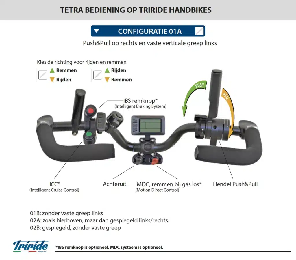 Triride heeft voor haar klanten ook uitgebreide mogelijkheden voor alternatieve bedieningen. Er zijn 7 basisconfiguraties binnen de Tetra bediening mogelijk. Onderstaand zijn deze afgebeeld. Configuratie 01A hebben wij op een showroom middel zitten en kan al snel uitgeprobeerd worden.