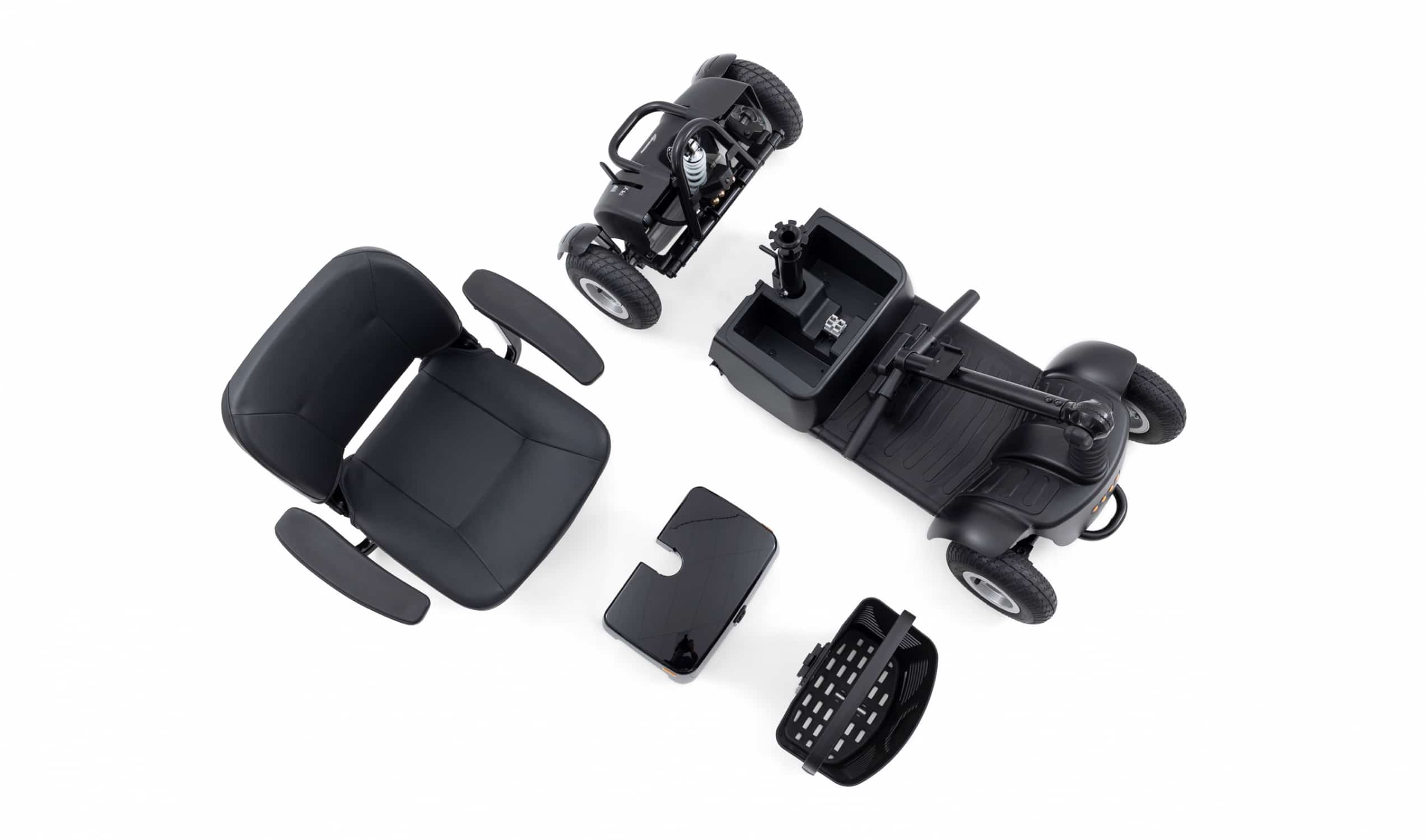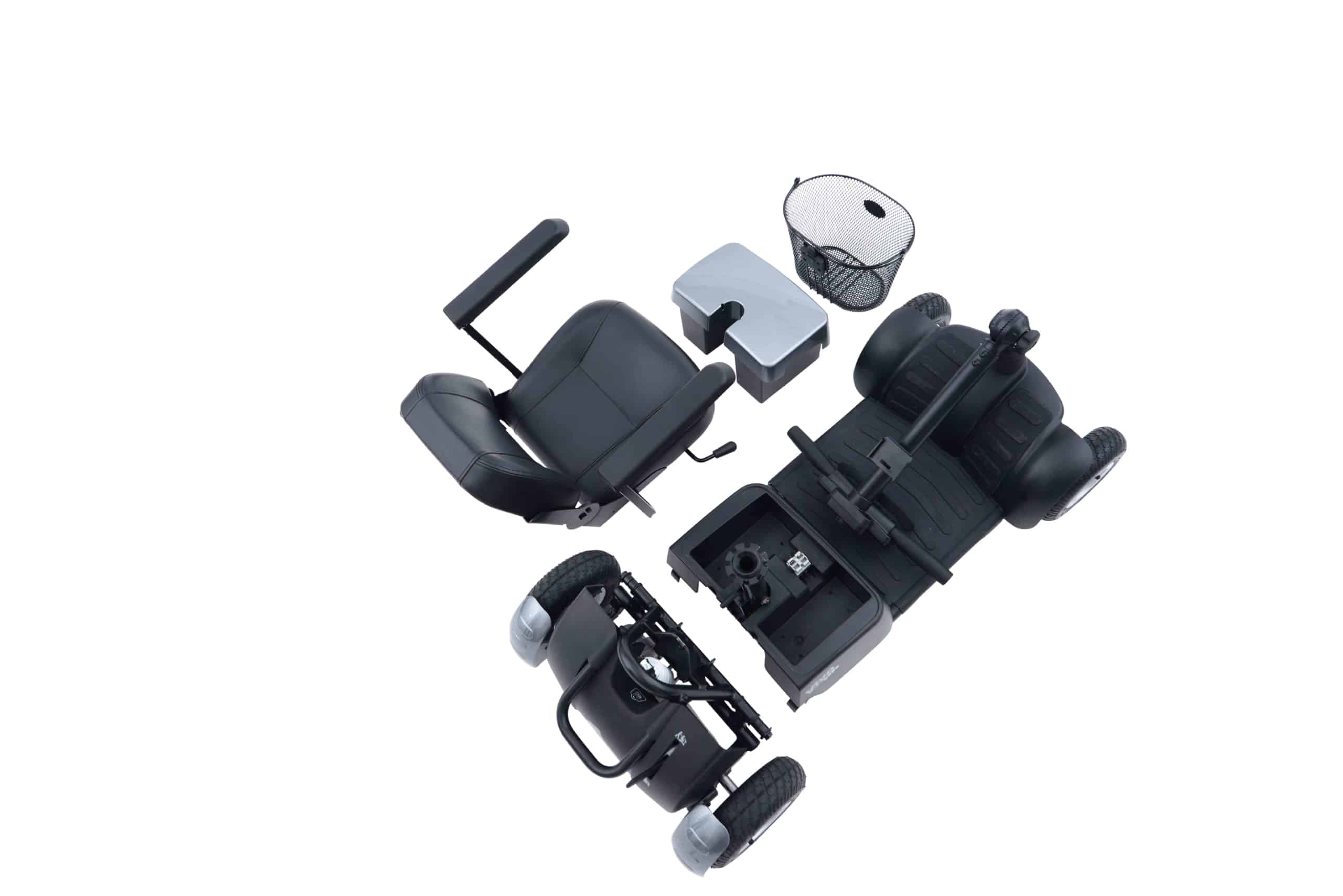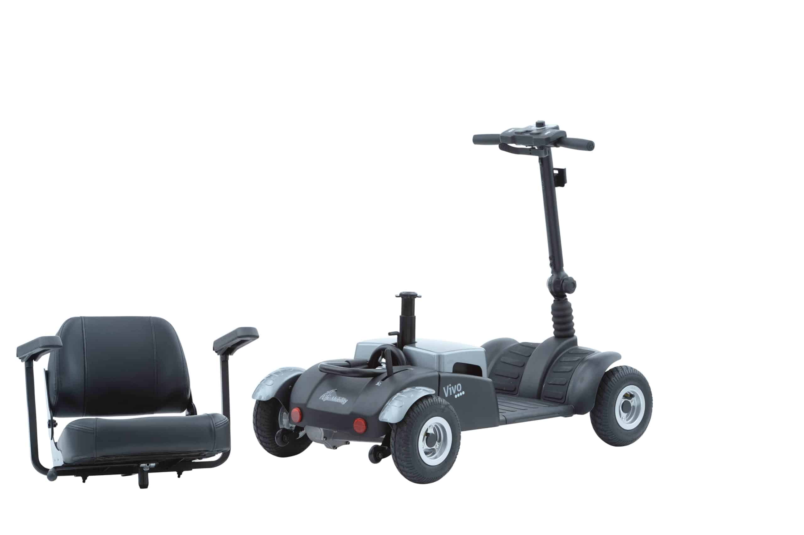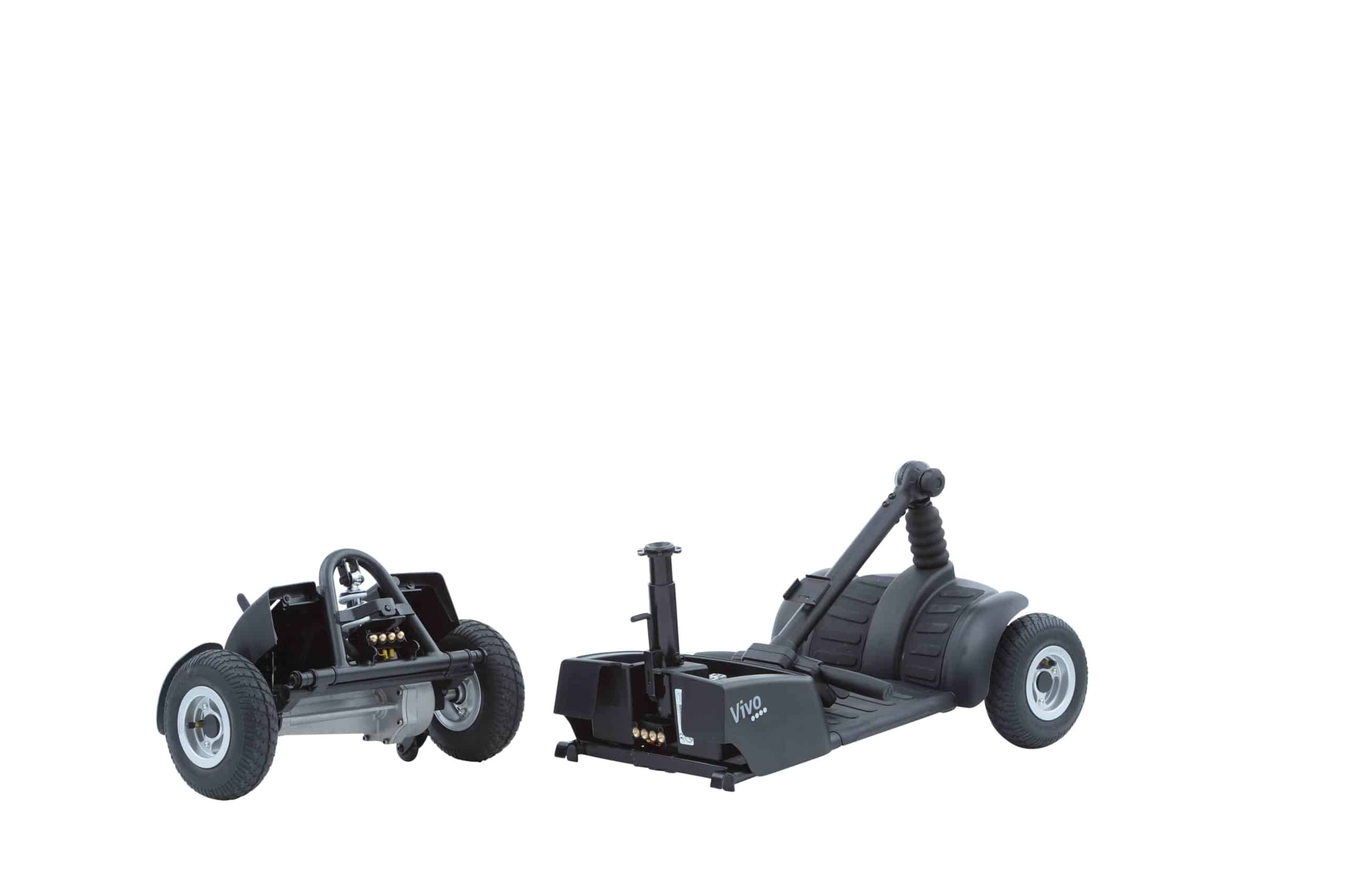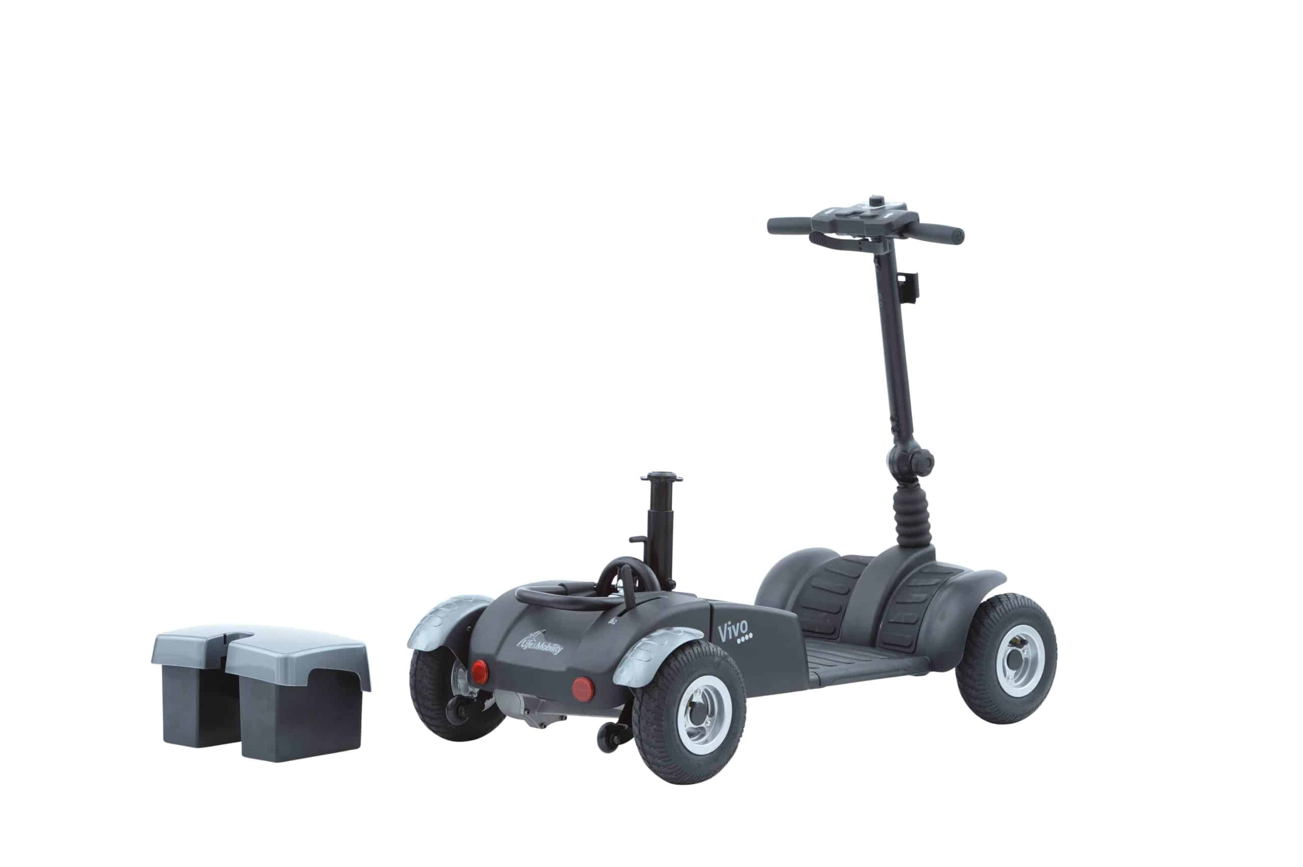 De demontage van de Vivo scootmobiel is zonder gebruik van gereedschap. De stoel en accubak tilt u omhoog. Het loskoppelen van de motor doet u via de hendel achter de stoelkolom. Zodra u de hendel omhoog tilt komt het motor gedeelte los. Het zwaarste gedeelte is het framedeel voor met een gewicht van 20,5 kg.