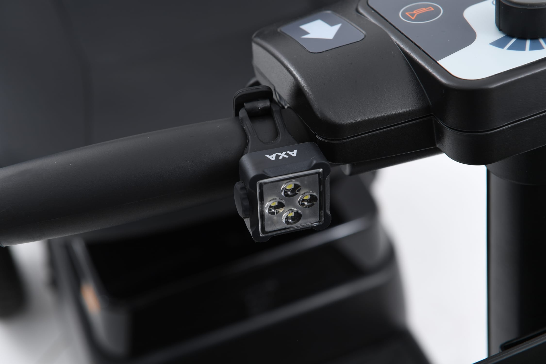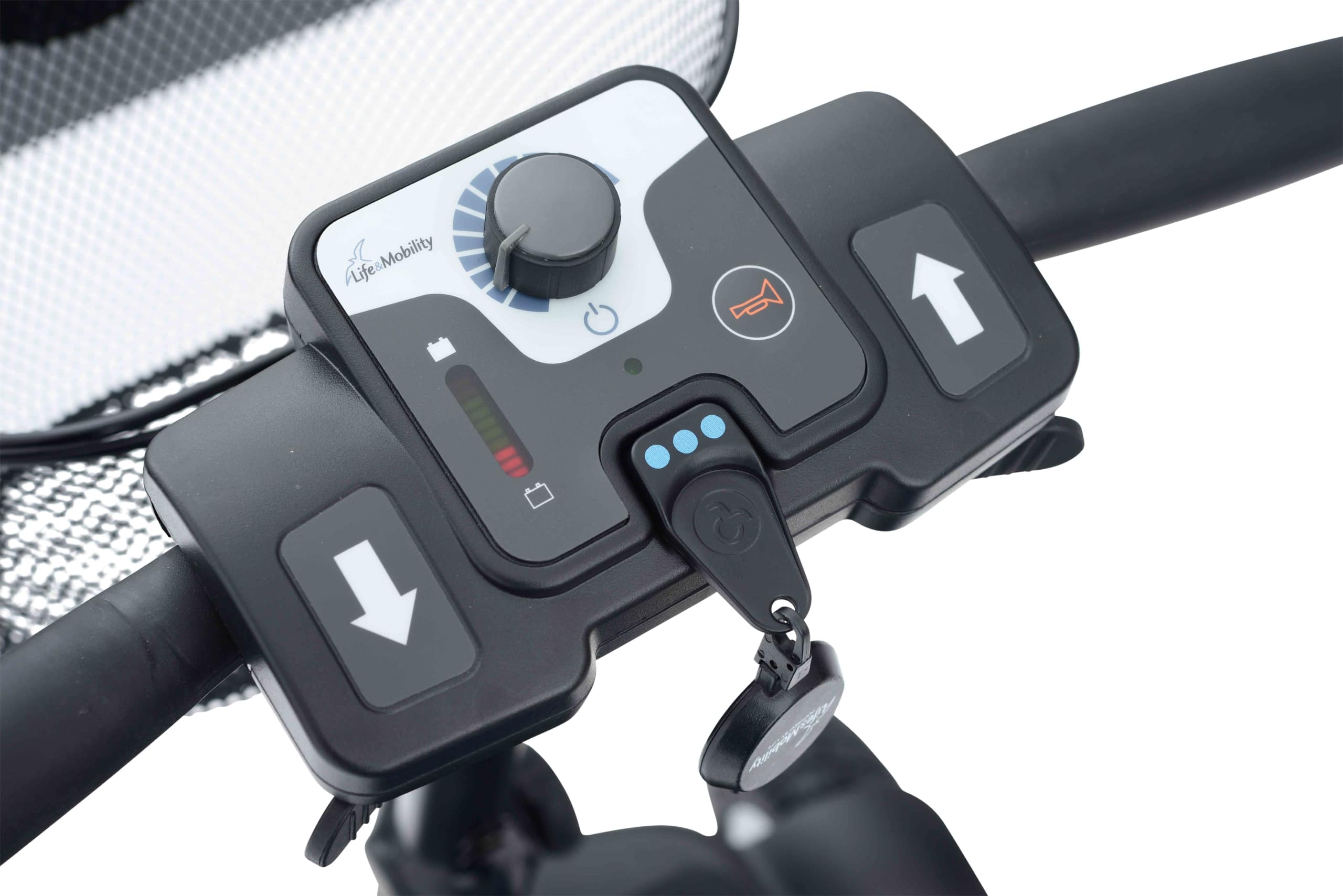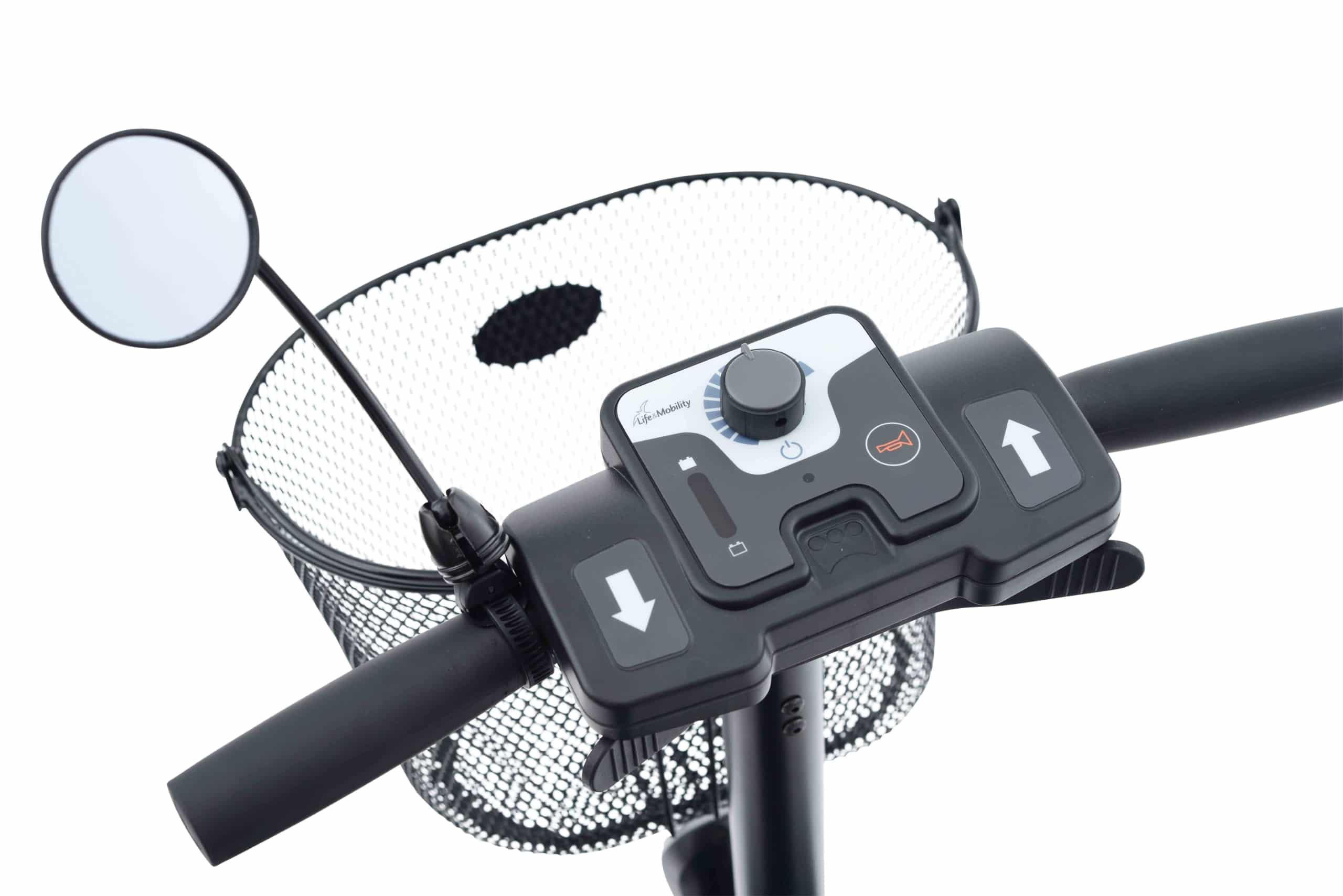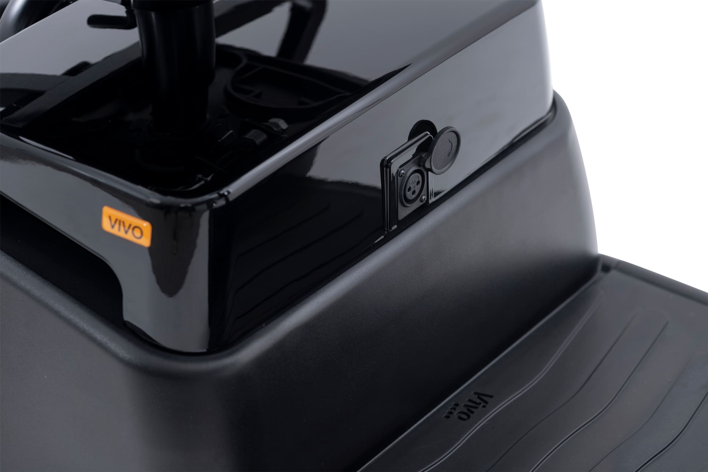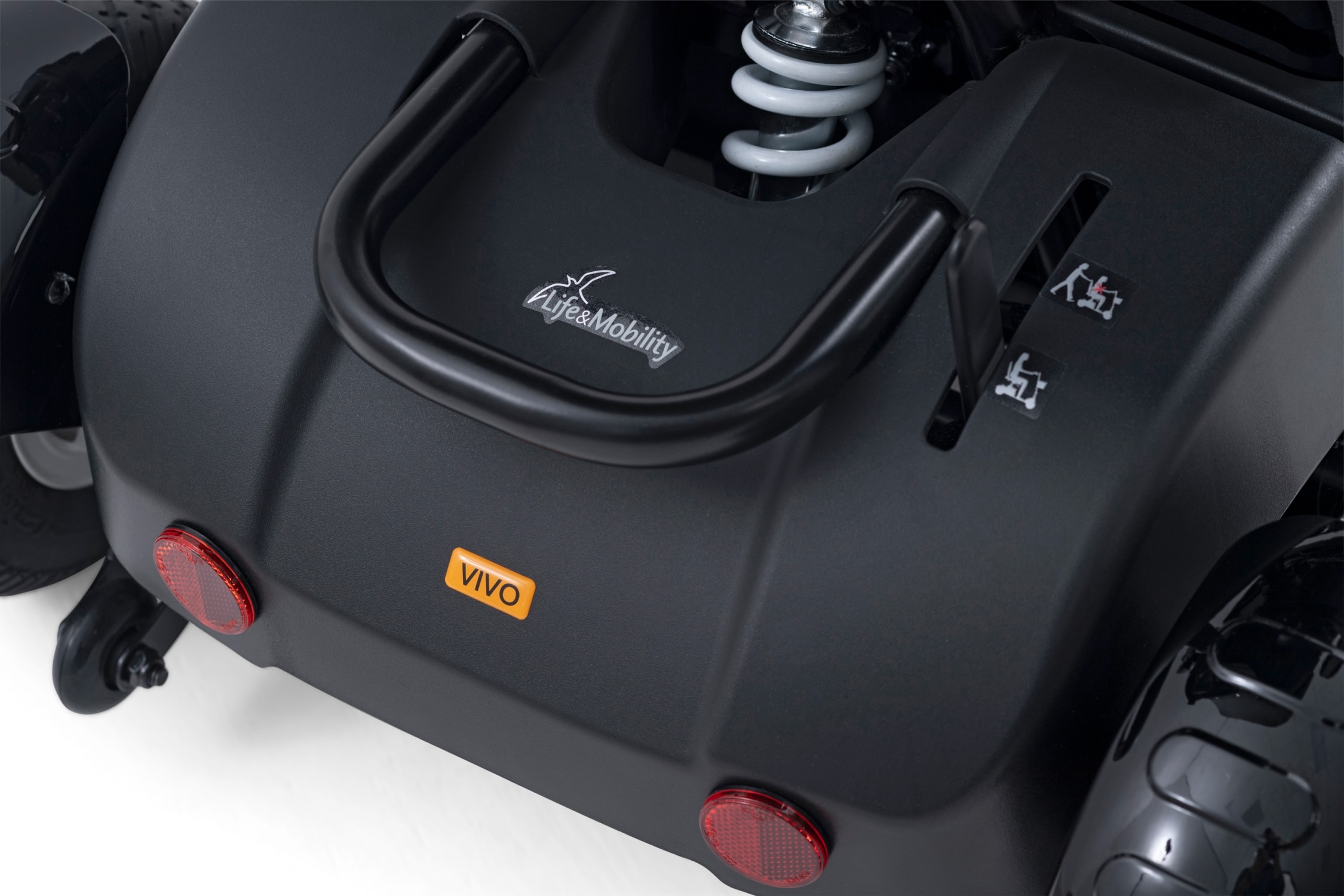 Uniek voor deze scootmobiel is de vering op de achteras en de grote luchtbanden. De vering zorgt ervoor dat schokken worden opgevangen, en door de grote bodemvrijheid is een ritje in het bos geen enkele probleem voor de Vivo. De bediening van de scootmobiel doet u met de duim. Deze bediening zit vlak onder het bedieningspaneel waar ook de accu indicatie, snelheidsregelaar en claxon zitten.